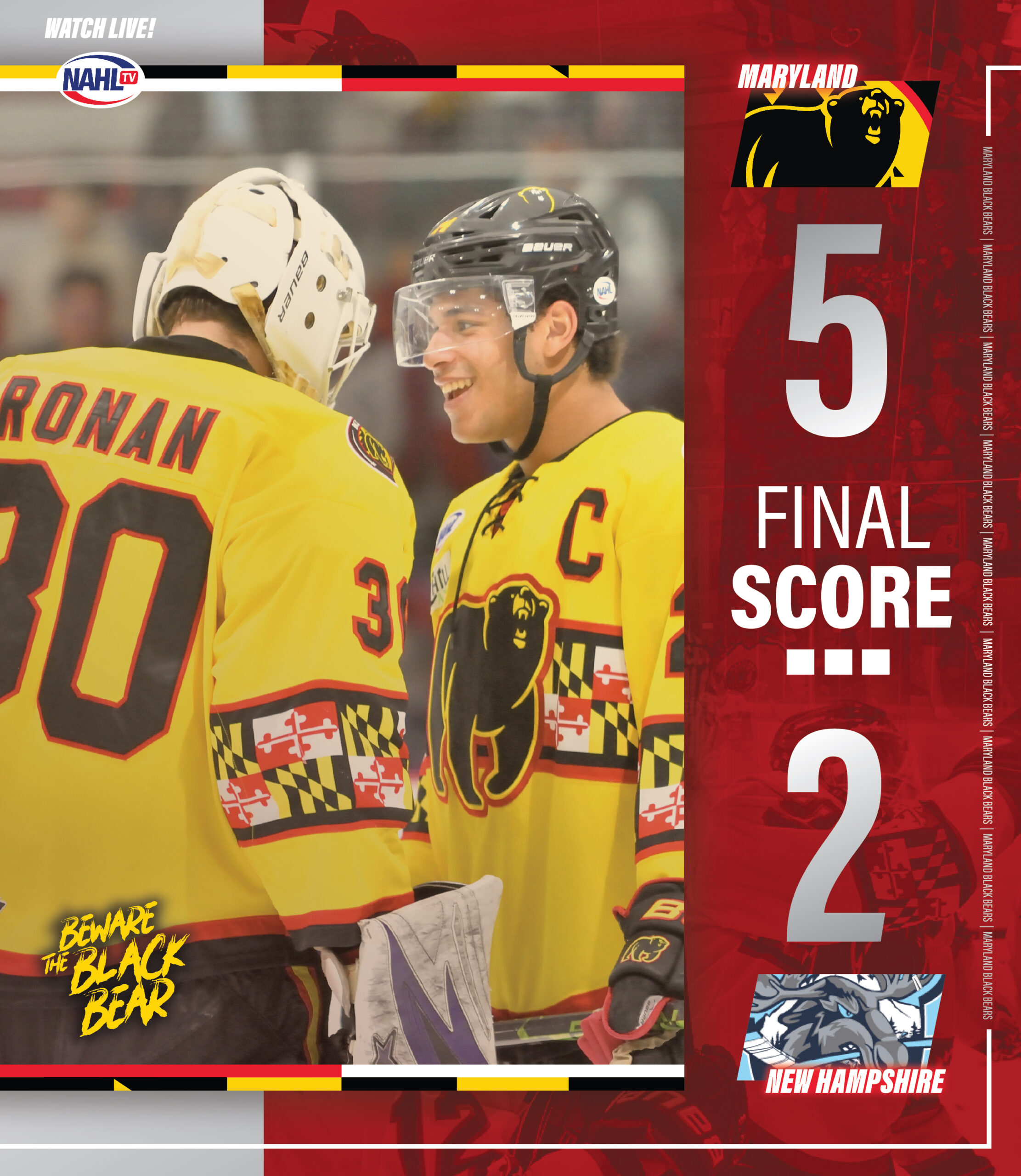 After Maryland secured a 4-1 win over the New Hampshire Mountain Kings on Friday night, the Black Bears took the ice Saturday night as the two teams rematched needing just one point to secure a berth in the 2024 Robertson Cup Playoffs. And thanks to another offensive outburst, Maryland did just that with a 5-2 win over the Mountain Kings.