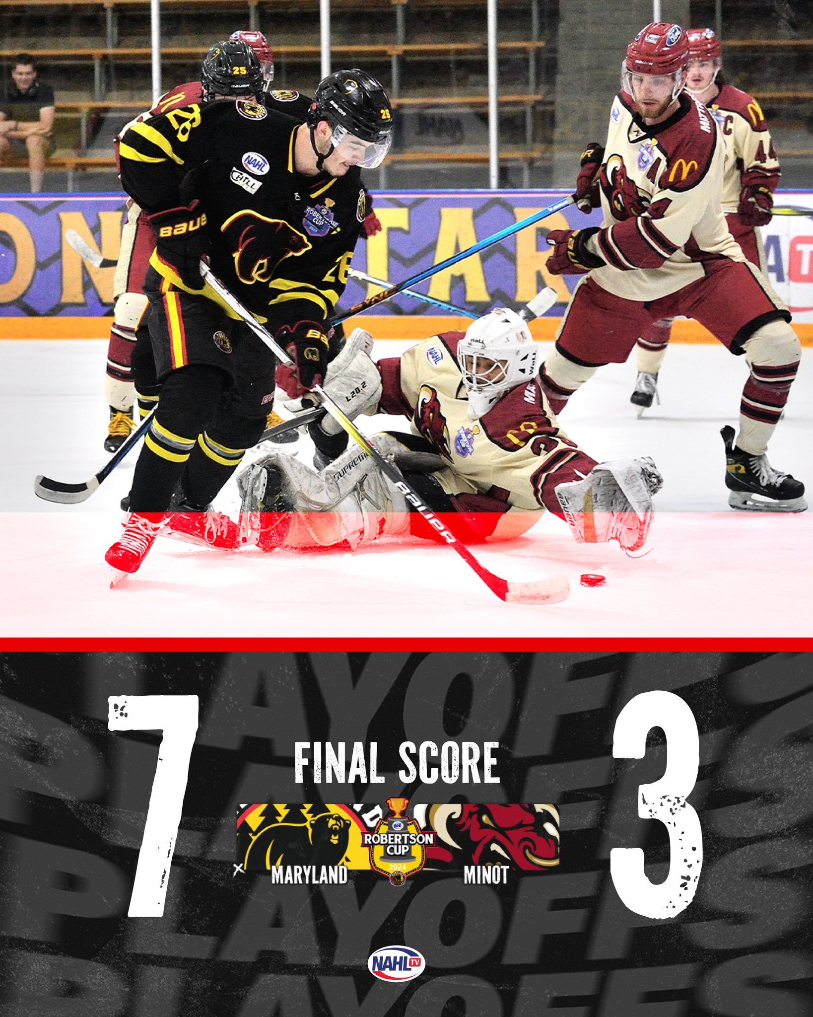 The Maryland Black Bears went back to Blaine, Minnesota, representing the East Division as its champions and tasked once again with facing the NAHL’s Central Division Champions at Fogerty Arena in a best-of-three series. This time representing the Central Division are the Minot Minotauros, who swept the Austin Bruins in three games before taking out the Bismark Bobcats in four games. After scoring ten goals in their last two games, the Black Bears kept the offense rolling as they put up seven goals in a 7-3 win, putting themselves one win away from an appearance in the Robertson Cup Final.