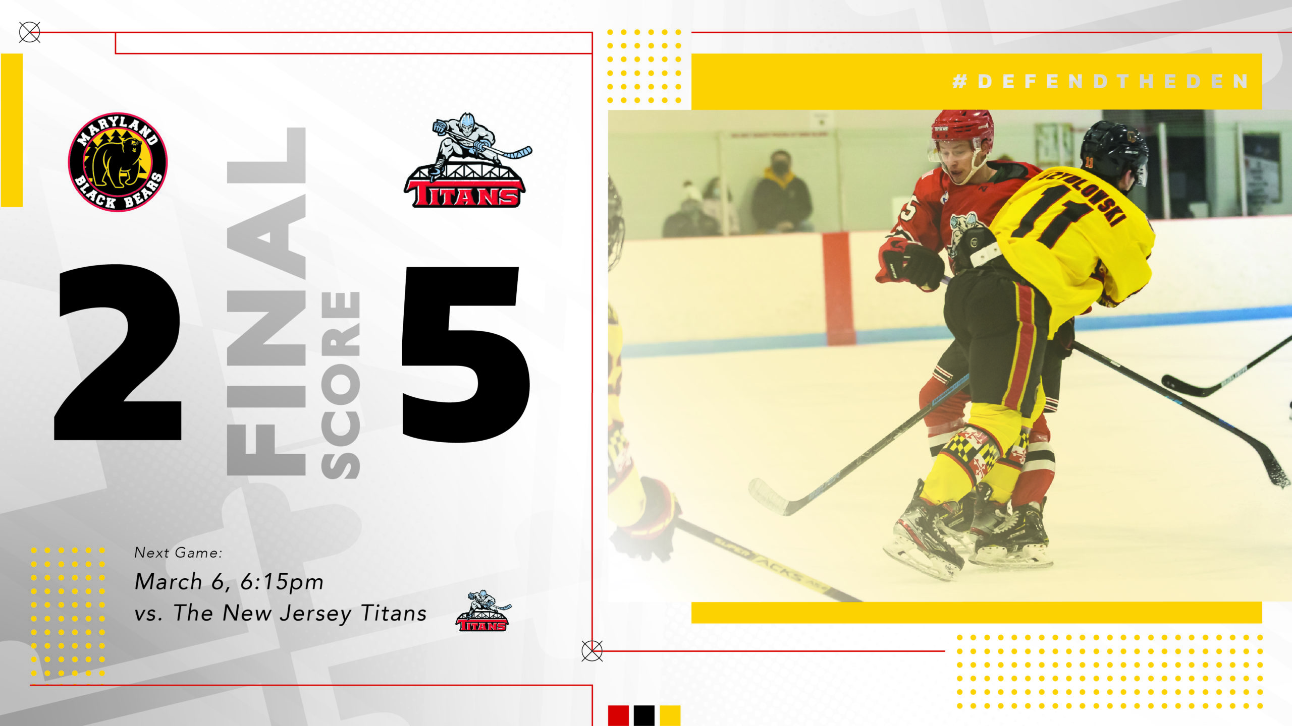 The Maryland Black Bears looked to snap a season-long eight-game losing streak as they took on the New Jersey Titans at Piney Orchard Ice Arena. Despite a last-ditch effort late in the third, the Black Bears could not overcome the Titans and dropped the game 5-2.