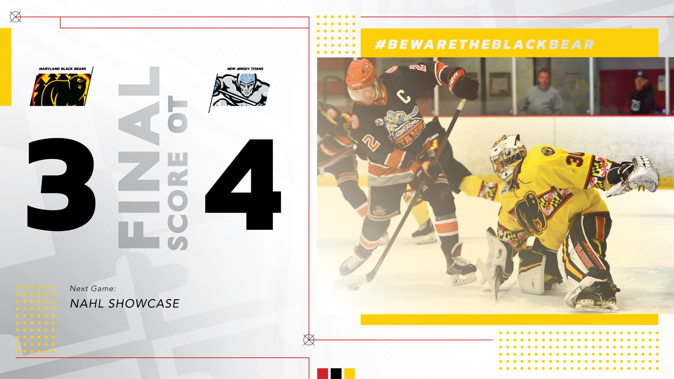 After defeating the New Jersey Titans 5-0 on opening night, the Maryland Black Bears looked to cap the weekend off with its first-ever opening weekend sweep. The Titans had other plans, however, downing the Black Bears 4-3 in overtime.
